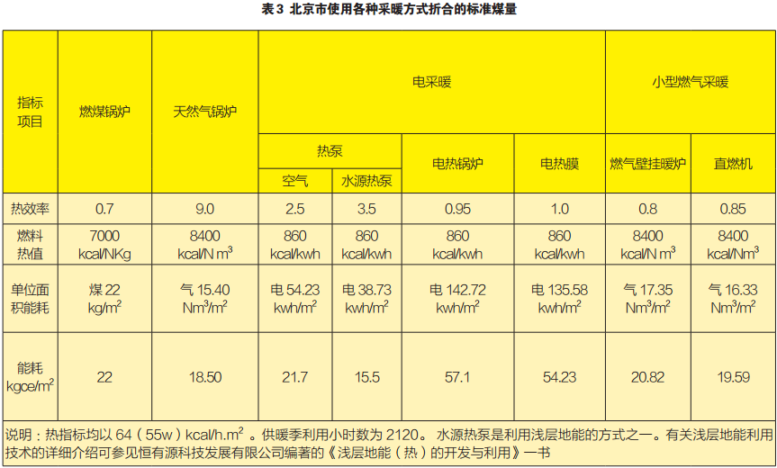 2005年,中國國際工程咨詢公司所做的對于北京市各種供暖方式使用能源和環境影響的比較研究中,也得出了利用淺層地能的熱泵技術,其節能效果最優的結論。該公司研究的北京各種采暖方式使用的能源折合標準煤量可見表3。