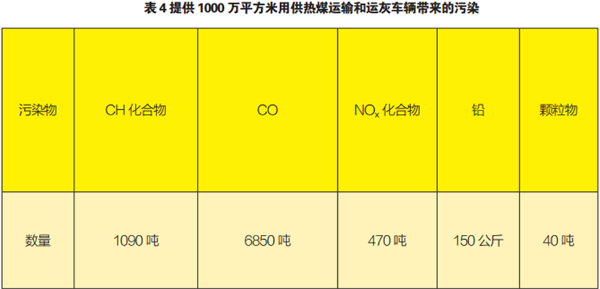 在以上分析中,我們僅涉及了供熱的直接能源消耗,在實際運用過程中,煤炭還需要有運輸的過程,城市燃煤鍋爐還有運煤灰的工作,這些是污染的另一個來源。有關部門計算了1000萬平方米供熱用煤運輸帶來的間接污染。見表4(未計噪聲污染及運輸車輛增加帶來的城市交通的惡化)。